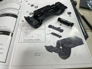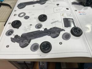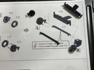 組み立て説明書の順にそって組み立てていきます。まずはフロントのタイヤの部分を組み立てます。