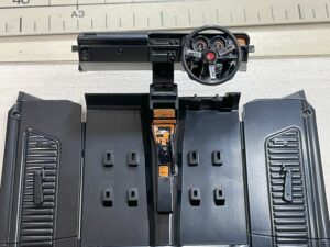 何とか貼り終わりました。ハンドル中央のマークやコンソールBOXの木目のパネルもシールです。