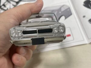 フロントとリアの窓部分にも黒いシールを貼っていきます。外装パーツを取り付けた後は