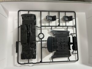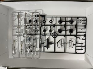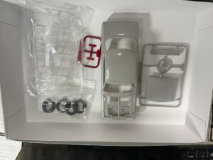 外箱です。完成写真ではなくイラストで描かれています。パーツです。ボディとゴム製のタイヤ等ですね。