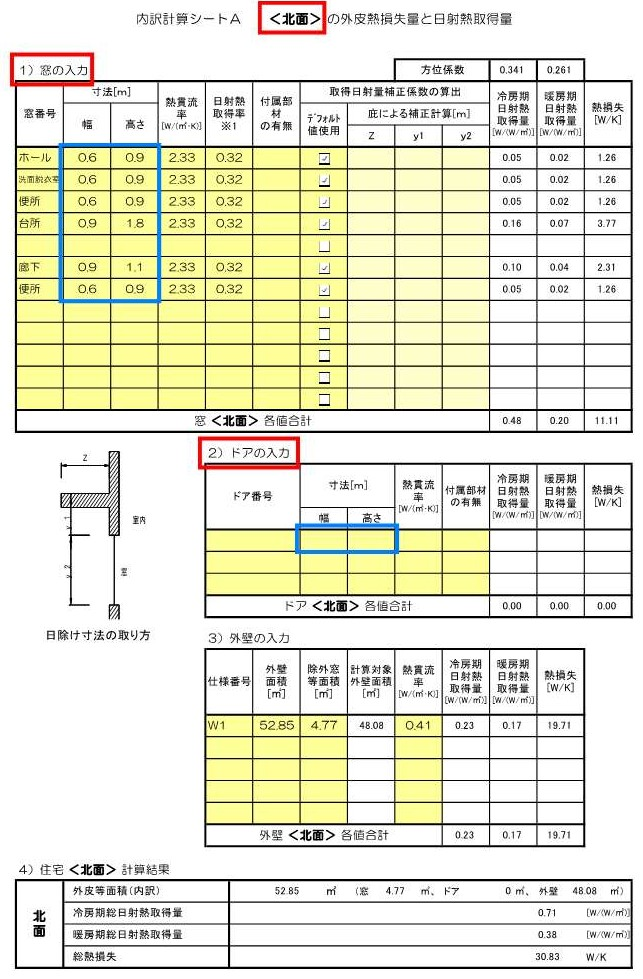 このシートでは、外壁に設けられた窓・玄関の寸法、外壁の外皮面積などを入力されています。私たちが外皮計算書を作成したら、平面図の窓・玄関の寸法と計算書の寸法が合っているか確認してみてください。(シートAの青囲み)