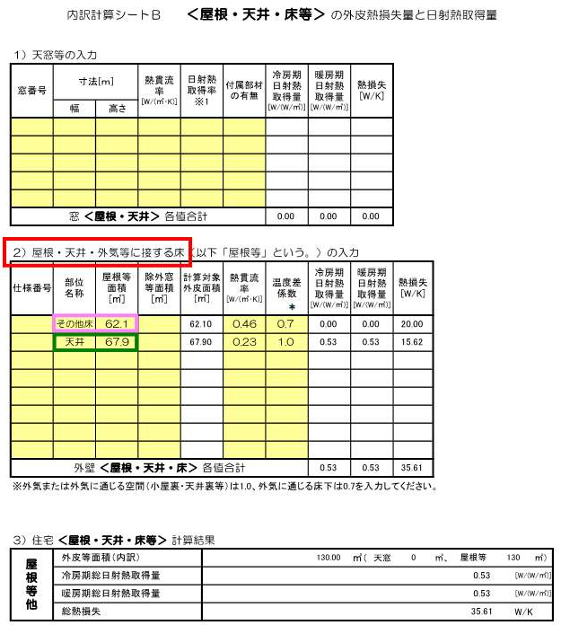 「その他床」というのは、1階の床断熱をしている範囲の面積が入力されているので、合わせて面積を確認してみてください。(平面図・シートBのピンク範囲)