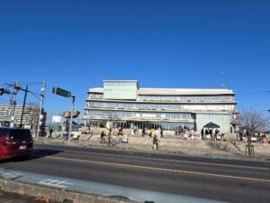 「志木市役所」前は大きな広場があり、道路を挟んだ先にはパンも販売するカフェがあり、その周りには川を眺められる芝生広場、そこには自由に使えるカウンターとチェアがあります。